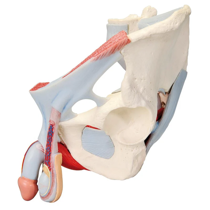 Mô hình bộ xương chậu nam gồm 7 phần, chi tiết minh họa cách các xương, dây chằng, mạch máu và dây thần kinh, cũng như các cơ cấu mạch bụng và các bộ phận sinh dục bên ngoài kết nối với nhau. Mô hình này hiển thị toàn bộ bộ xương chậu, qua đó đã được đặt một phần chia ngang. Phần phải của cơ quan xung quanh hậu môn bên ngoài, M. ischiocavernosus, M. transversus perinei profundus và superficialis và M. bulbospongiosus có thể được tháo ra cùng nhau.